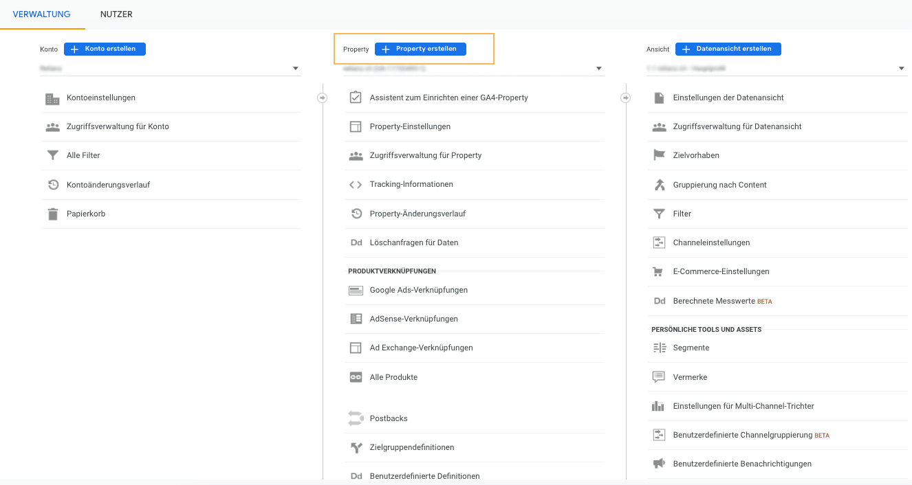 Um die historischen Daten nicht zu gefährden, muss die GA4 Property bereits vorab unabhängig und parallel zu Universal Analytics eingerichtet werden. Auf diese Weise haben Sie zwei separate Properties, eine mit Universal Analytics und eine mit GA 4, welche gleichzeitig und unabhängig voneinander arbeiten.